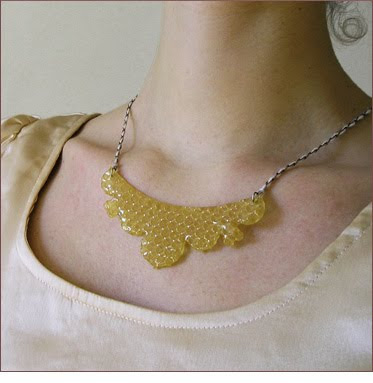 Milk & Honey Necklace, made from a piece of honeycomb encased in plastic, by